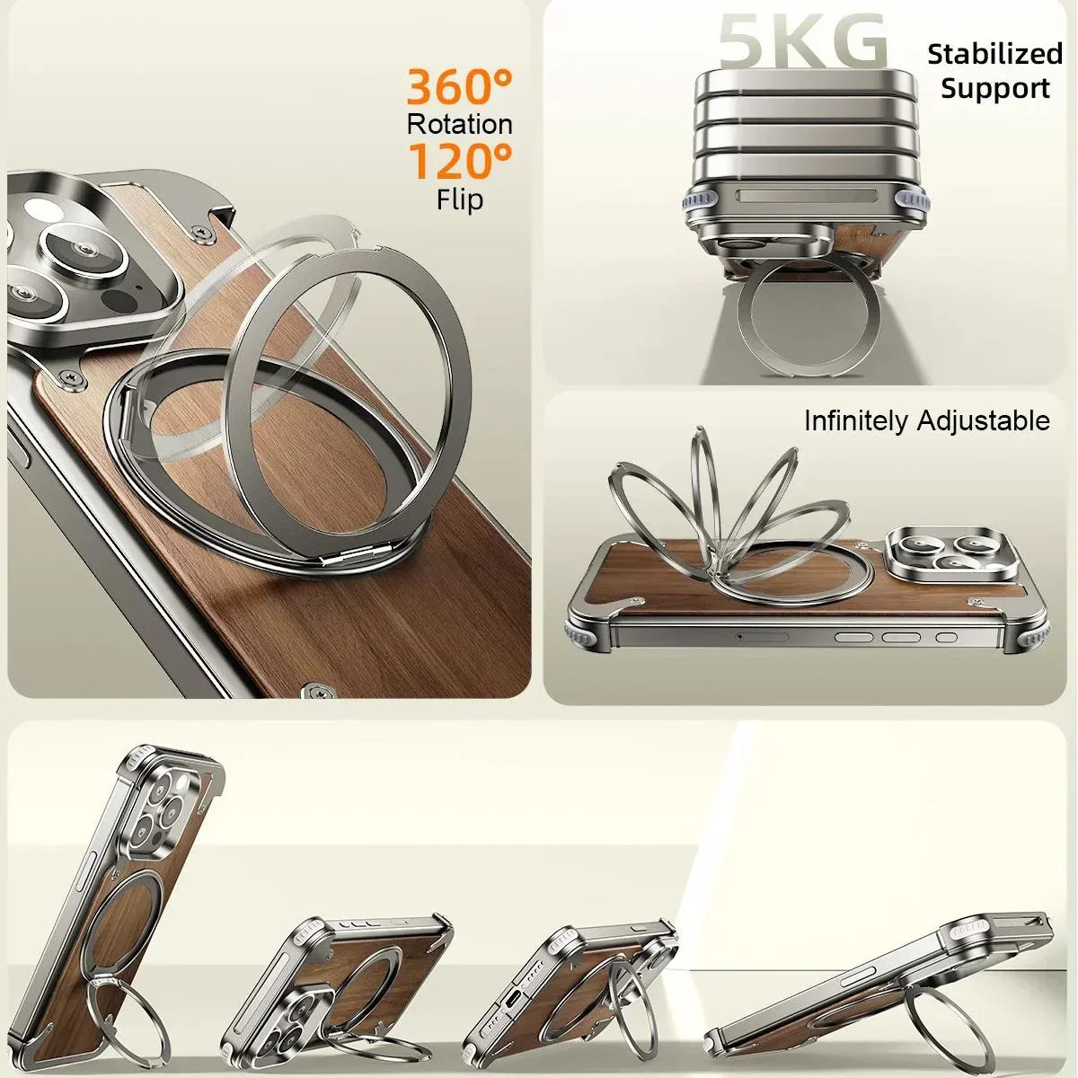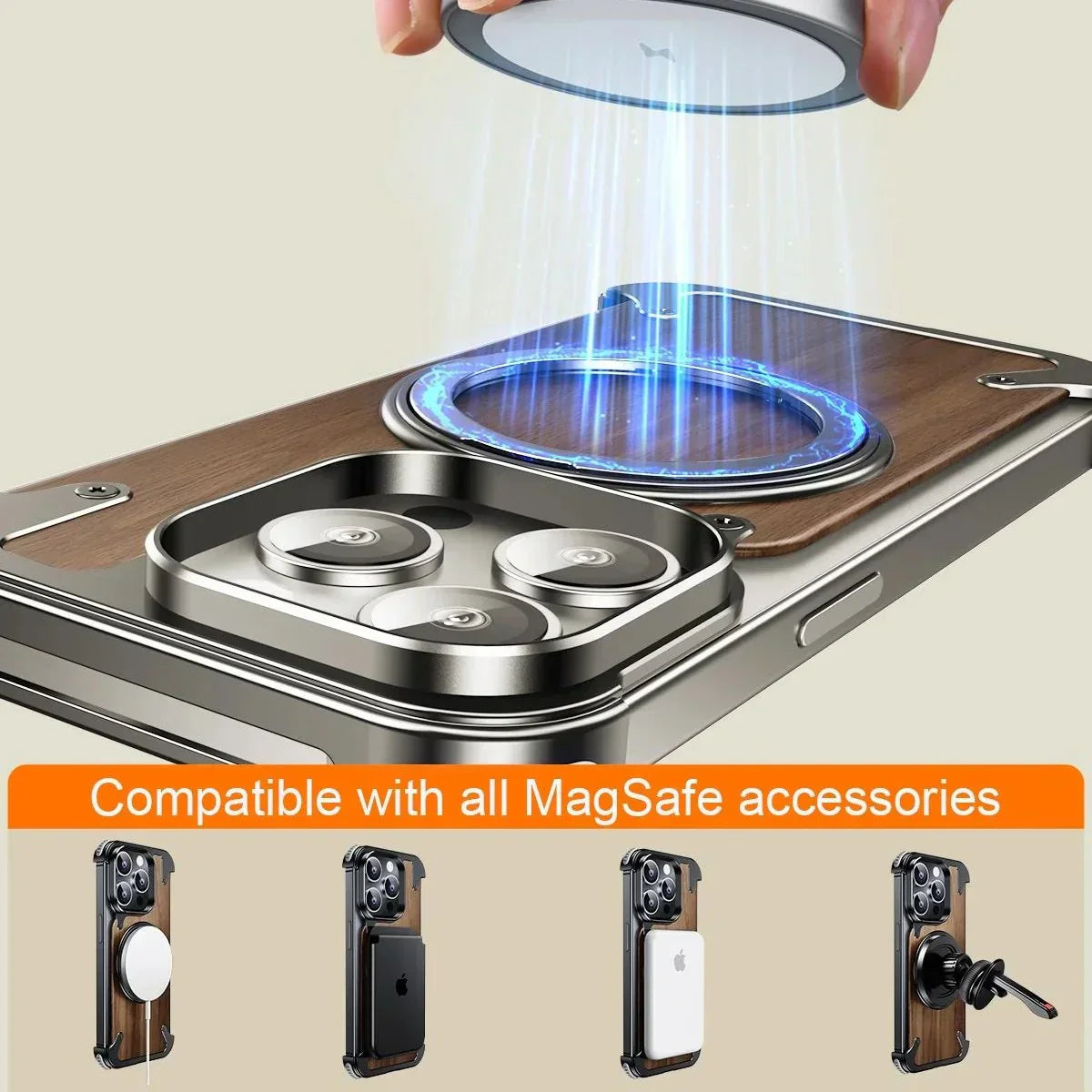 The Rustic Solid Wood Metal MagSafe Case combines the durability of solid wood with the strength of metal to create a phone case that's both stylish and robust. This case features a unique design, with a MagSafe-compatible structure that allows for easy wireless charging and secure attachment of MagSafe accessories.